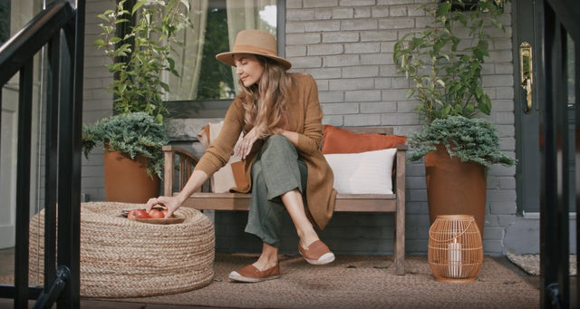 Minimal fall style is calm, warm, and effortless. Start with a neutral palette and layer texture for interest — a warm-toned woven doormat and small porch rug, a large pale green throw to echo fall foliage, and a single thick white candle in a lantern or glass vase for a glimmery glow. Add as many candles as you like — the neutral base makes it easy to bring in extra cozy touches.
