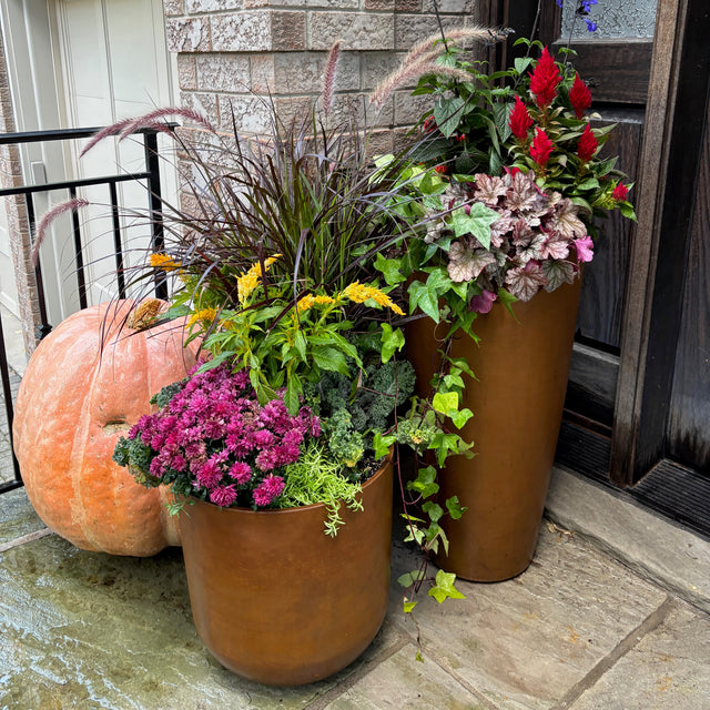 Tiffany Mah’s arrangement brings together an artful mix of colour, texture, and resilience to capture the vibrancy of fall. Using the “filler, spiller, thriller” design principle, she combined Chrysanthemums, Celosia, and Ornamental Peppers for striking structure and seasonal warmth, complemented by Ornamental Kale, Cabbage, and Chartreuse Sedum for contrast. Trailing ivy and Carex ‘Frosted Curls’ soften the edges, while Purple Fountain Grass and Blue Anise Sage introduce height and rhythm where space allows. Each planter is thoughtfully composed for both beauty and function, creating a layered, enduring display that celebrates fall’s abundance.meet the patina collection