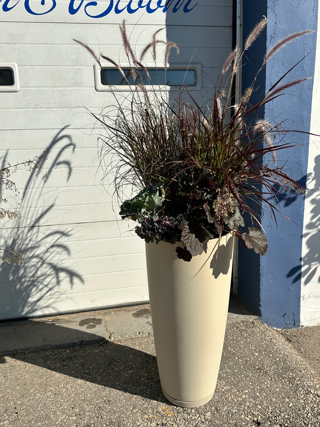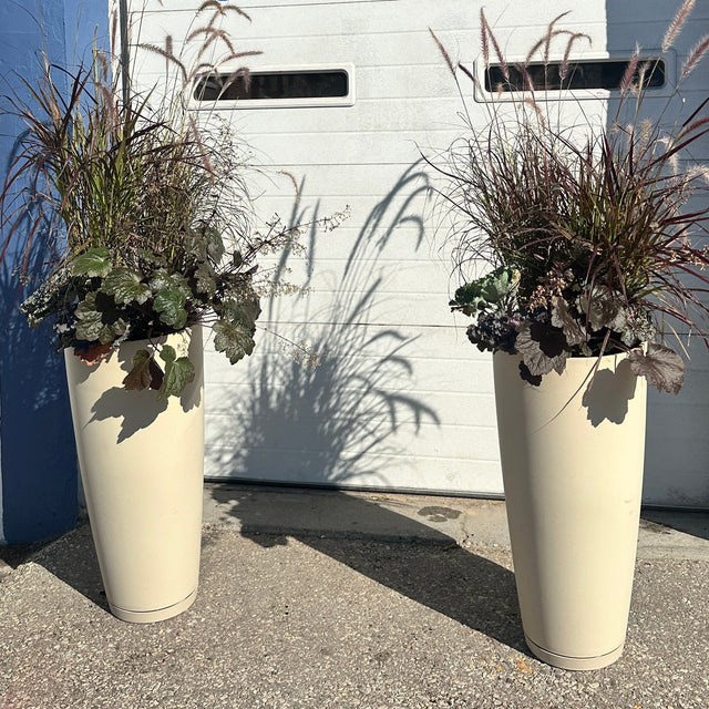 Becky’s design embraces the understated beauty of a monotone palette, pairing rich, dark foliage with a neutral beige planter for a look that feels refined and cohesive. By selecting fountain grass to mirror the planter’s slender silhouette, she achieves a balanced scale and visual harmony. The result is a modern, textural statement that’s both contemporary and timeless.meet the mason selena planters