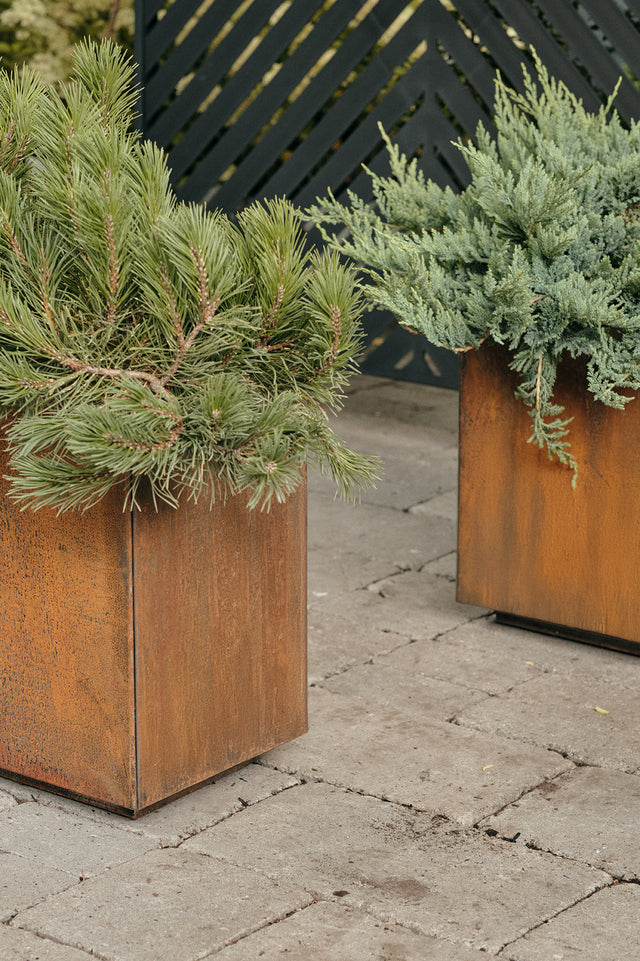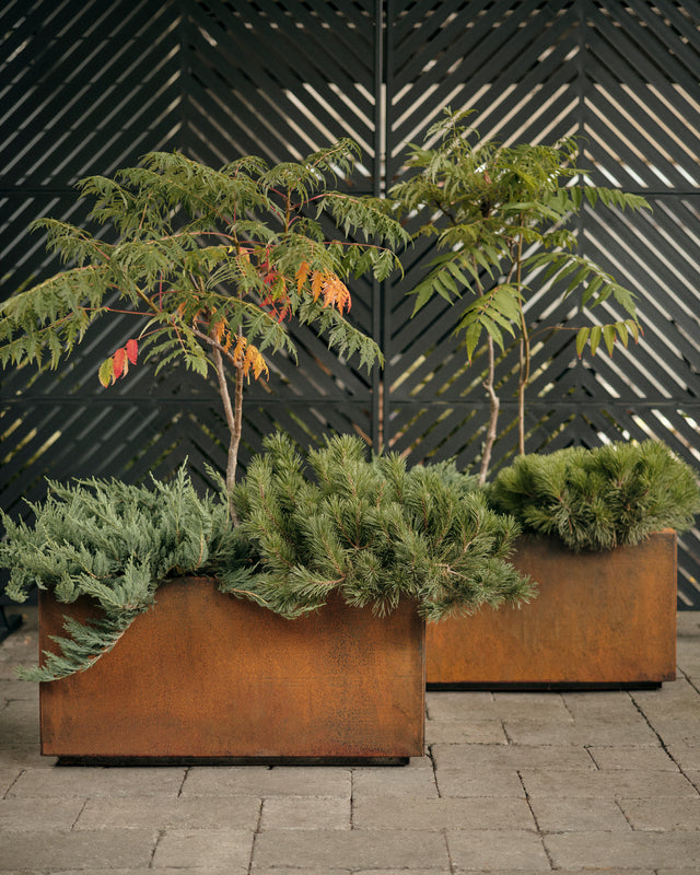 Bring the North to your doorstep captures the untamed beauty of Ontario’s natural landscape. Inspired by the rugged roadside and forest edge, we combined bold Staghorn Sumac for height and movement, compact Mugo Pine for evergreen structure, and trailing Juniper to soften the base like wild groundcover. Set in a Corten long box planter, the rich rusted patina complements late-summer tones — creating a look that feels both curated and raw, like a drive through cottage country brought home.meet the corten collection