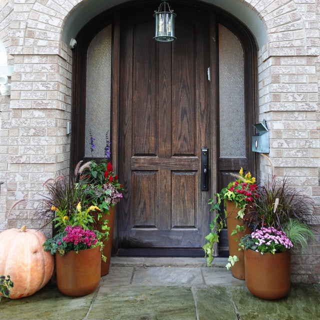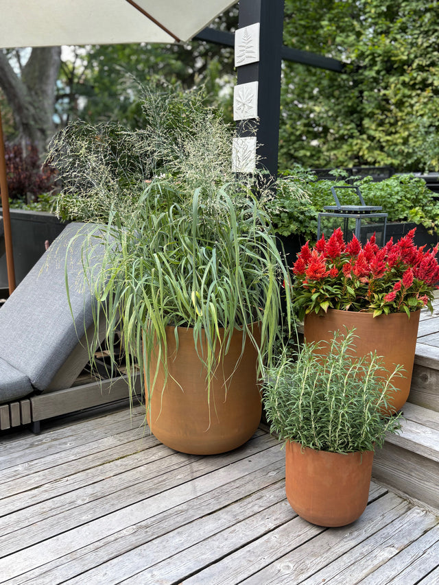 For her fall-inspired arrangement, biophilic designer Tara Soloway used the Patina Kona Series planters to create a warm, grounded composition that reflects the richness of the season. Ornamental grasses add height, texture, and soft movement, while fiery red celosia introduces a bold burst of colour. Fresh rosemary completes the design with an edible, fragrant touch. Together, these elements form a balanced and inviting trio that celebrates fall’s natural tones while feeling fresh, functional, and connected to nature.meet the patina kona planters