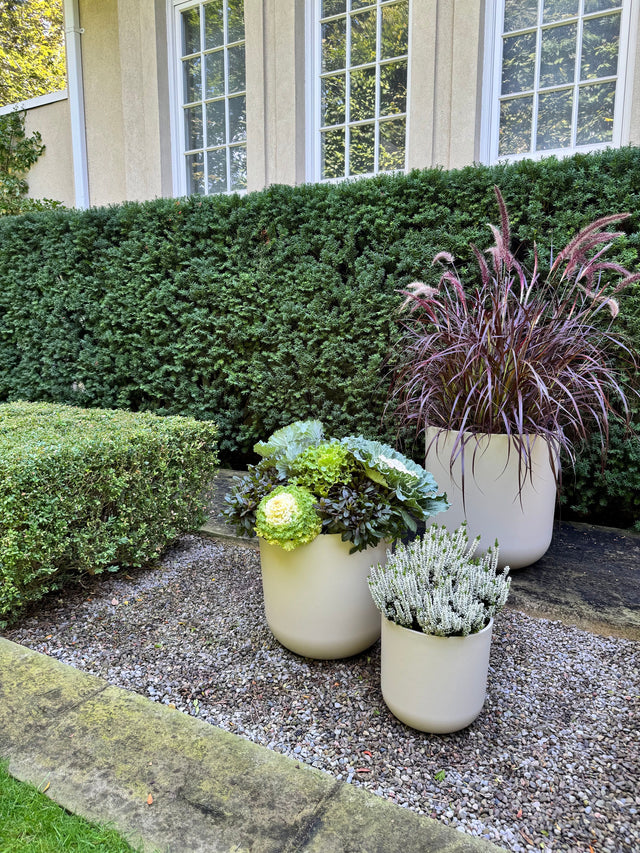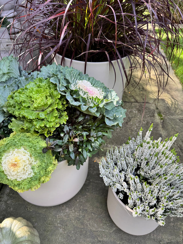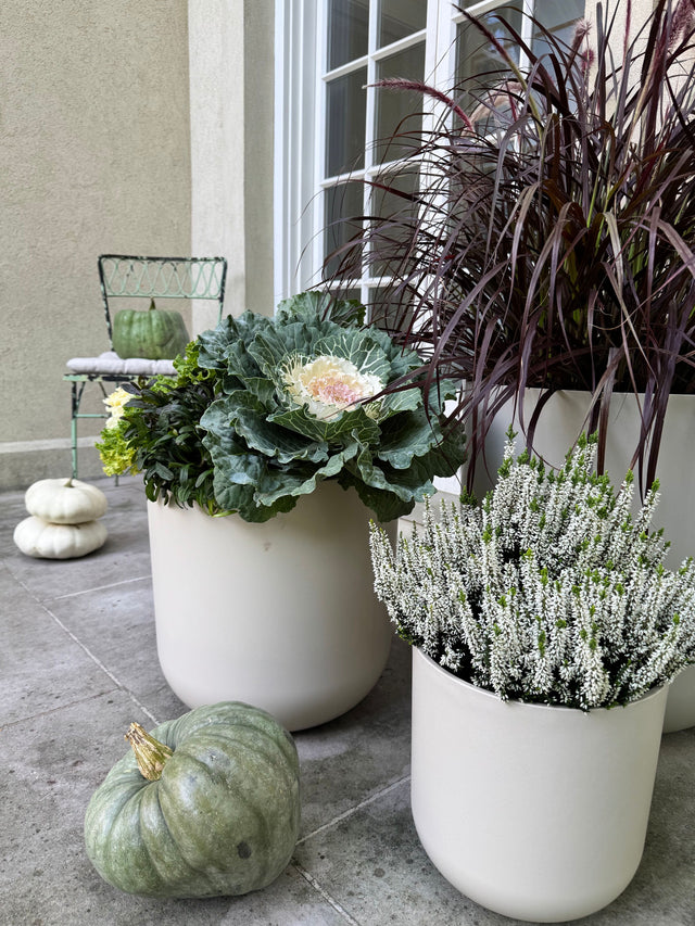 Designer Emmeline styled the Mason Kona planter trio to create a serene, textural arrangement rooted in contrast and form. Grasses and heathers in cozy mocha and latte tones stand out against the planters’ neutral cream finish, evoking warmth and sophistication. Cool-toned decorative cabbage and kale bring balance, rounding out the design with organic structure and effortless elegance—an elevated celebration of autumn’s quiet beauty.meet the mason kona trio planters
