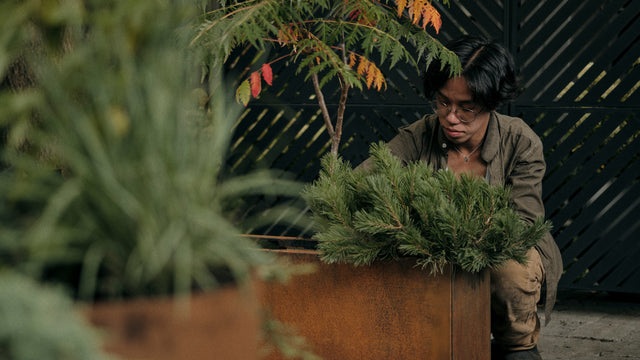 Bring the north to your doorstep. Bold Staghorn Sumac rises like wild roadside growth, Mugo Pine adds compact evergreen structure, and trailing Juniper softens the edges like rocky groundcover. Set in the corten long box planter , the rusted patina blends beautifully with late-summer tones — curated yet wild, echoing the spirit of a cottage drive through Ontario’s forests.